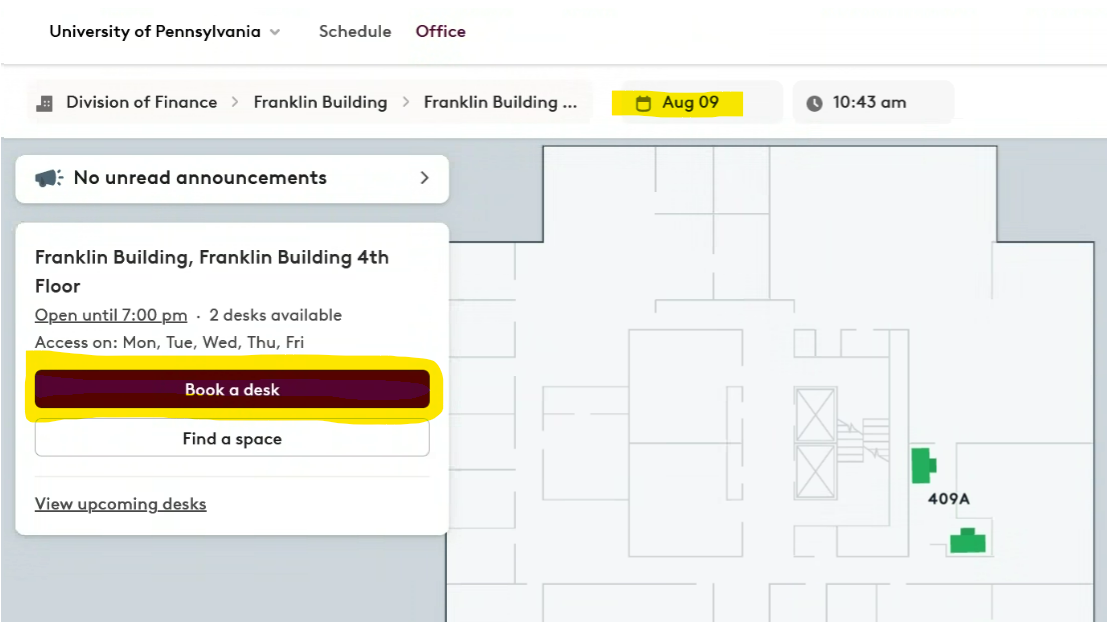 2. Use the calendar to select the day the you want to book a desk, then select the Book a desk button.