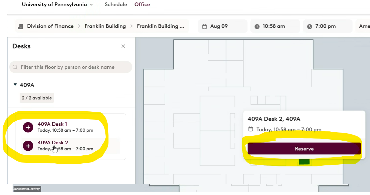 3. Select from the list of avaialable desks, and then select the Reserve button.
