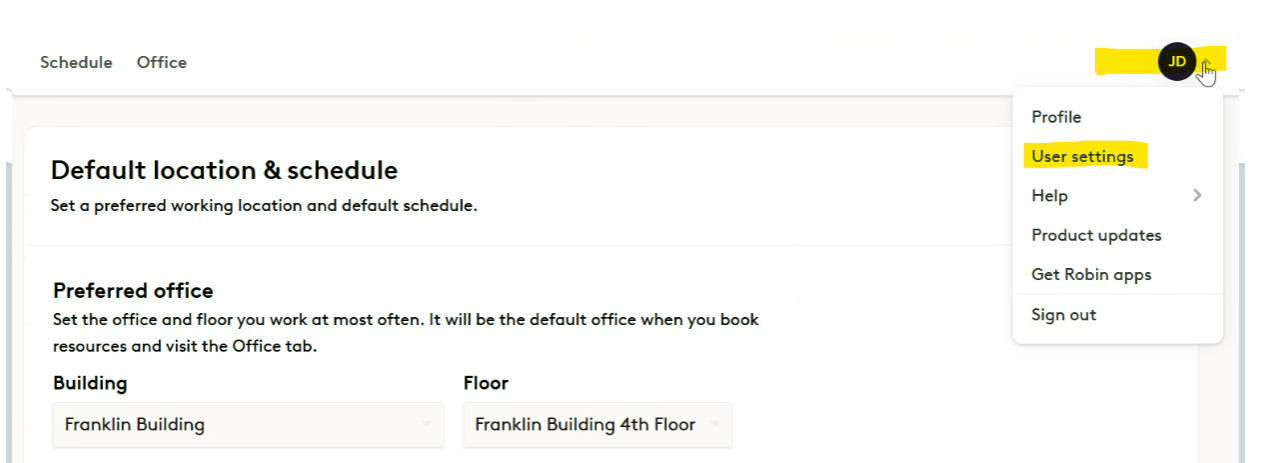 2. Select your profile by selecting the the black circle with your initials in the top right corner, in the drop down select user settings.