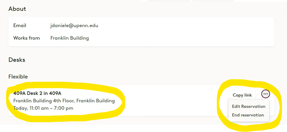 3. Identfy the desk booking you want to cancel and select the 3 dots and select End reservation from the drop down.