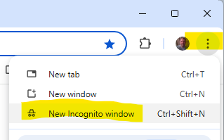 To open a Chrome Incognito browser tab, open a new tab, select the 3 dots and select New Incognito window. If you are still unable to access the DOF Sharepoint site, please contact us.